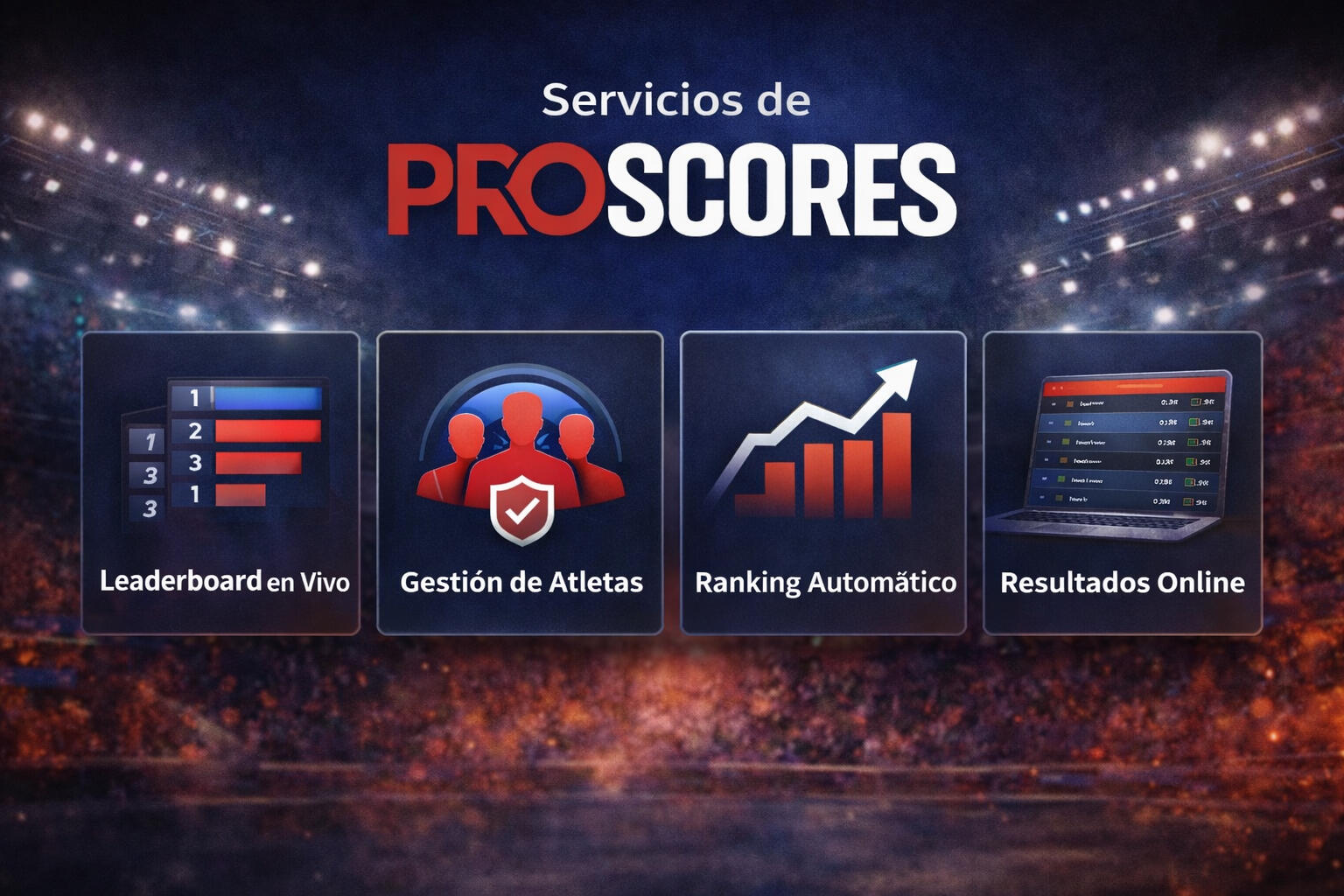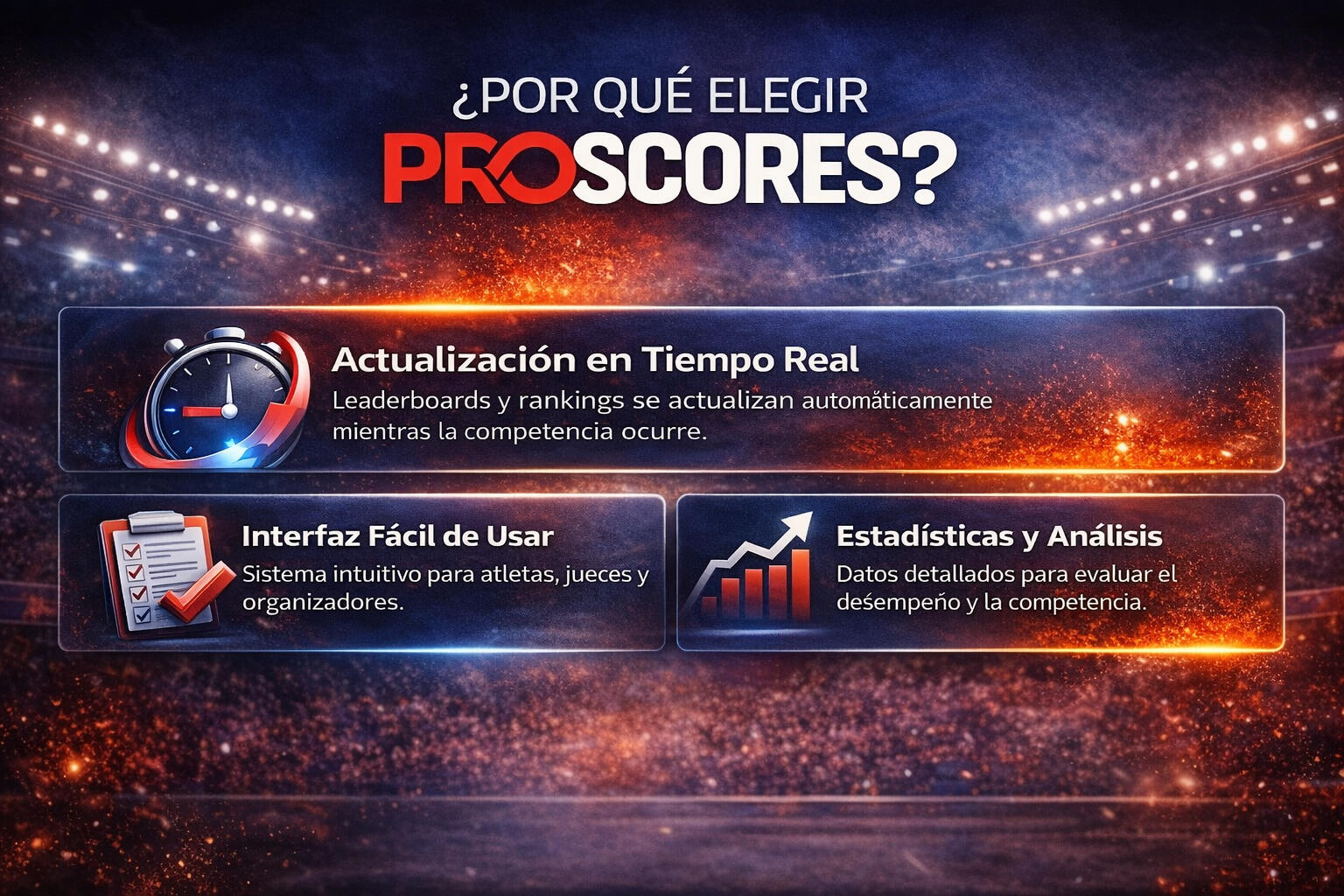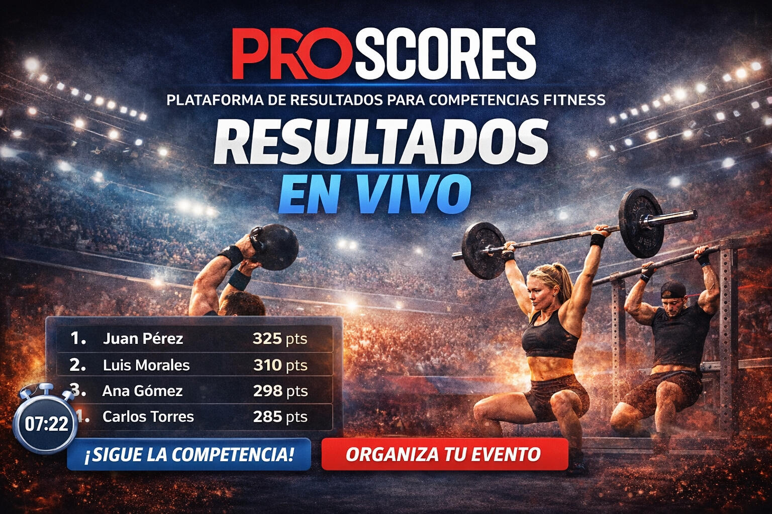 Proscores es una plataforma de scoring para competencias fitness que permite gestionar atletas, registrar resultados y mostrar rankings en tiempo real.⸻2. ¿Los resultados se actualizan en vivo?Sí. Los resultados se actualizan automáticamente en tiempo real mientras se desarrollan los eventos de la competencia.⸻3. ¿Los atletas pueden ver su posición en el ranking?Sí. Los atletas y espectadores pueden consultar rankings, resultados y estadísticas desde cualquier dispositivo.⸻4. ¿Proscores sirve para cualquier tipo de competencia fitness?Sí. La plataforma se adapta a distintos formatos como: